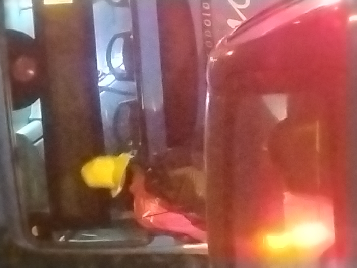 An abstract, indoor composition features a blurred yellow object on the left adjacent to a dark cylindrical form. Behind these, a pair of seats are visible with ambiguous light sources. A prominent red object, likely a container with obscured label text, dominates the right side, further distorting the scene with its reflective surface. The entire image is blurred with unclear definition making specific objects impossible to distinguish.
