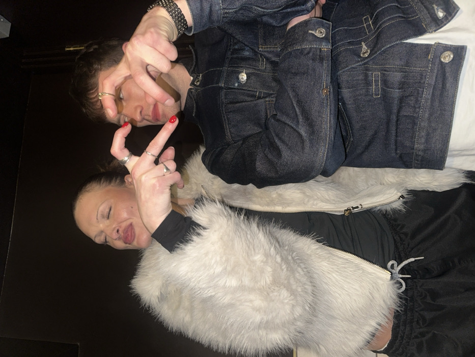 Two individuals pose closely, making finger gestures. The lower person, a woman, wears a white, shaggy fur jacket over black attire. The upper person, appearing male, dons a dark denim jacket over a white shirt. The woman's nails are painted red, and both individuals wear rings. A dark backdrop provides contrast, enhancing the subjects' clothing and gestures. The image appears to be taken at an unconventional angle, possibly upside down.