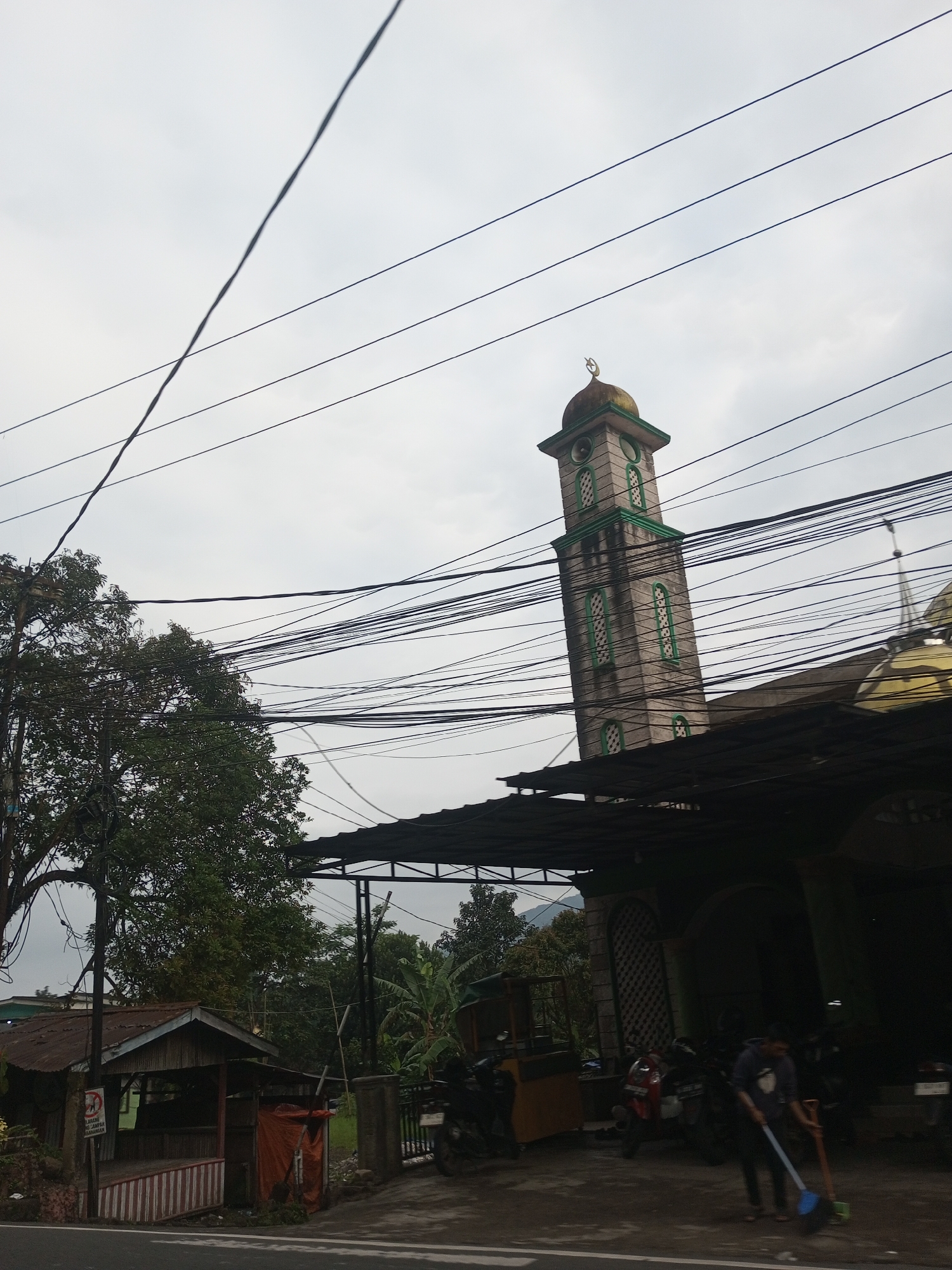 mosque in an unidentified location. The mosque features a tall minaret with a green and gold dome topped with a crescent moon. Power lines crisscross the sky above the mosque. To the left of the mosque is a large tree and a small roadside structure with a red and white striped design. In front of the mosque, there are several parked motorcycles and a person sweeping the ground with a broom. The weather appears cloudy. The background includes greenery and a glimpse of a distant hill.