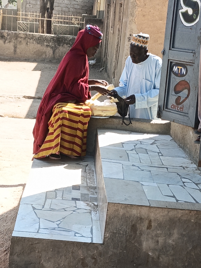 In Zango, Nigeria, an outdoor scene depicts two individuals engaged in an apparent transaction