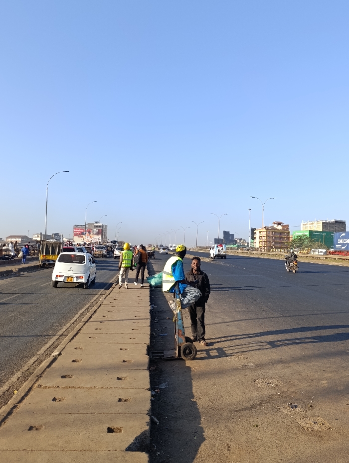 A sunny daytime street scene shows two men standing next to a trolley. One man in a dark jacket stands beside the trolley, while another wearing a yellow hard hat and safety vest is seated on it. Behind them are multiple lanes of a busy highway with cars, trucks, and motorcycles. People walk along the roadside, and buildings are visible in the distance under a clear blue sky.