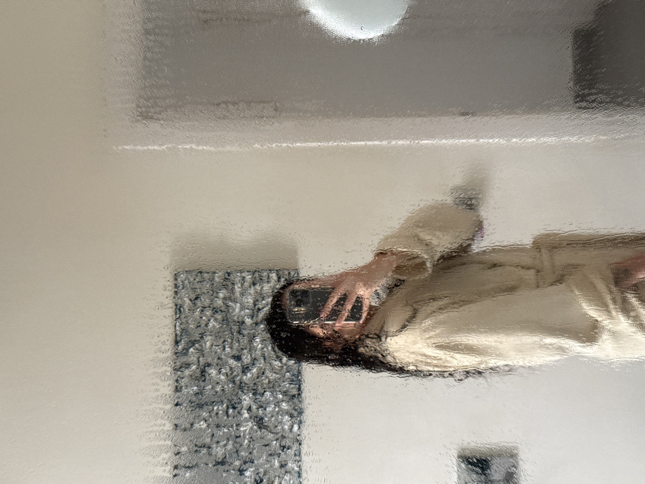 The image depicts an indoor scene, likely a bathroom, in Palma de Mallorca, Spain, viewed through a wet or frosted glass barrier. A single individual stands centrally, facing slightly to the right of the frame. This individual possesses long, dark, damp hair and is clad in a light beige or tan terry cloth bathrobe, secured at the waist. The individual's right hand holds a dark-colored smartphone, positioned to obscure their face, actively taking a selfie. In the background, to the left, a rectangular abstract artwork with a textured, metallic appearance in shades of grey and silver is mounted on a light-colored wall. Below the artwork, a small, dark rectangular object is partially visible. To the right of the individual, behind the glass barrier, a shower or enclosed space is suggested, featuring a diffuse circular light source or reflection. No other individuals or significant objects are discernible.