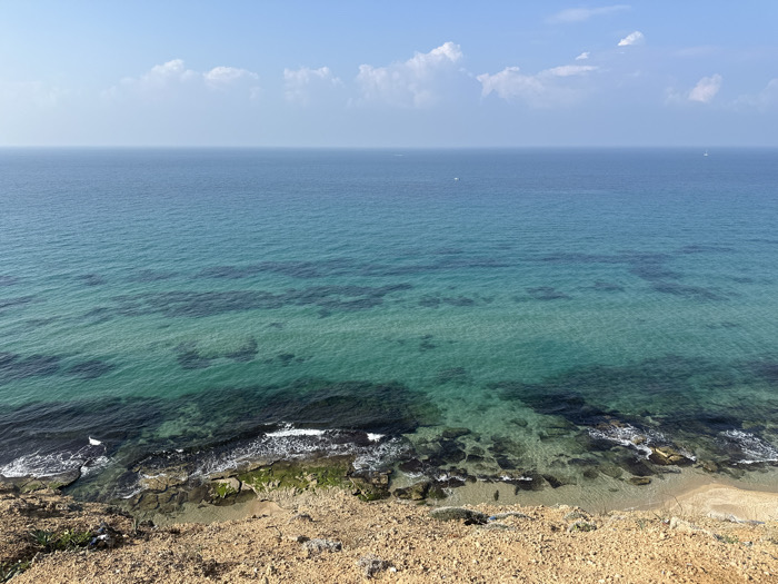 The image displays an elevated view of the Mediterranean Sea coastline in Herzliya, Israel. The foreground, approximately the bottom one-quarter, consists of a dry, light brown, granular earth cliffside with visible rock outcrops and minimal sparse green vegetation. To the immediate right, a narrow strip of light-colored sand borders the water. The offshore water transitions from clear, shallow turquoise and emerald green near the shore, revealing a rocky seabed with numerous dark rock formations and patches of marine growth, to deeper shades of blue further out. Small white waves are observed breaking against the rocky shore. The sea extends to a distinct horizon line. The sky above is a light azure with scattered, wispy white cumulus clouds. Two small, white vessels are faintly visible on the distant water, close to the horizon. No individuals are present in the frame.