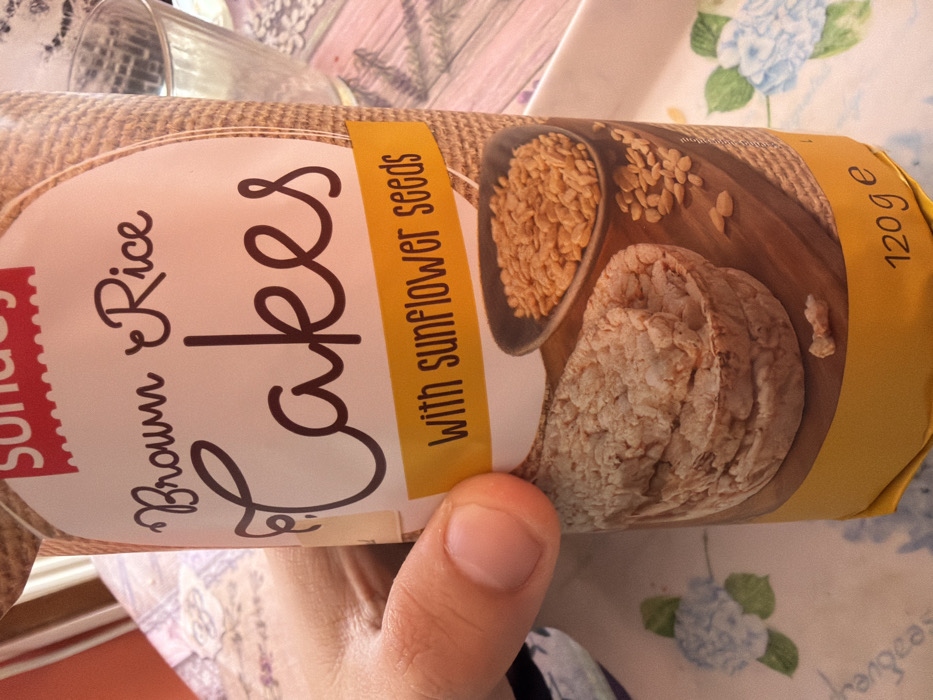 - "A close-up, eye-level shot in Kavarna, Bulgaria, depicts a light-skinned human hand holding a cylindrical package of "Sunday Brown Rice Cakes with sunflower seeds" by FM-U8vBE2, licensed under CC BY 4.0