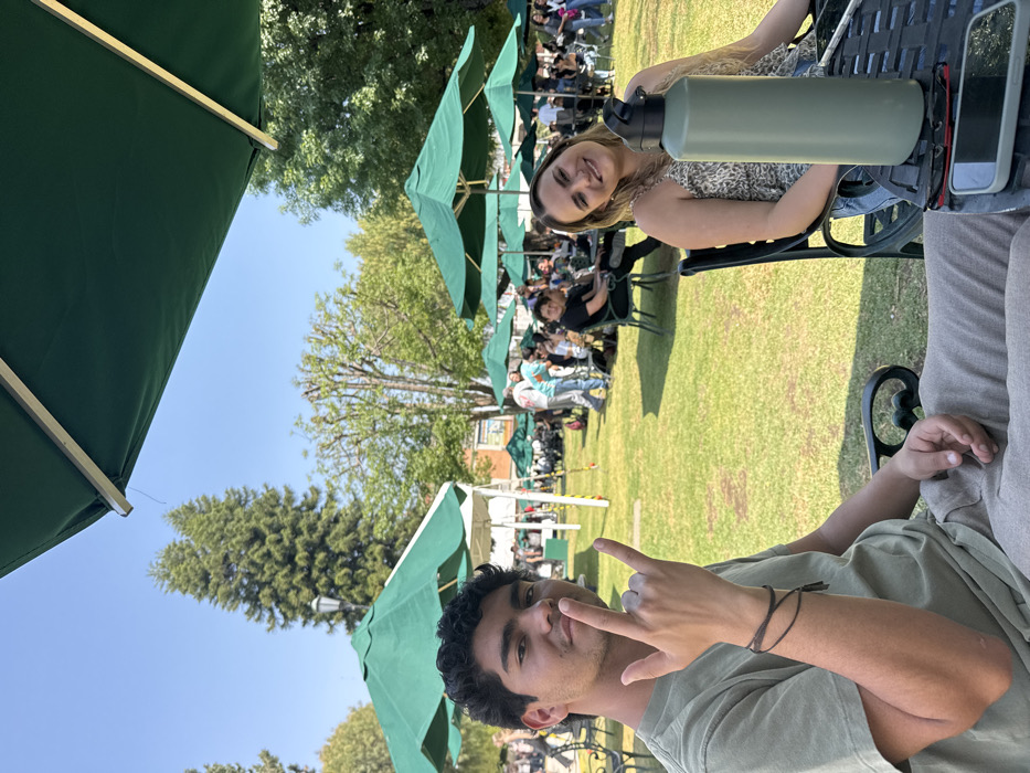 Two people sit at a table under green umbrellas on a grassy area. A woman with blonde hair smiles, a green water bottle and phone on the table. A man makes a rock-on hand gesture towards the camera. Numerous other people sit at tables with green umbrellas in the background. Green trees surround the area. The sky is blue.