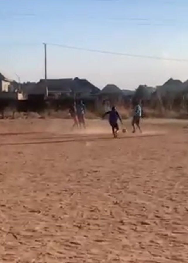 group of people playing soccer on a dirt field. The field is surrounded by houses and a blue sky is visible overhead. There are several people on the field, all wearing casual clothing. They are running around and kicking a soccer ball. Dust is kicked up as they run. Some voices can be heard in the background, potentially coordinating play.