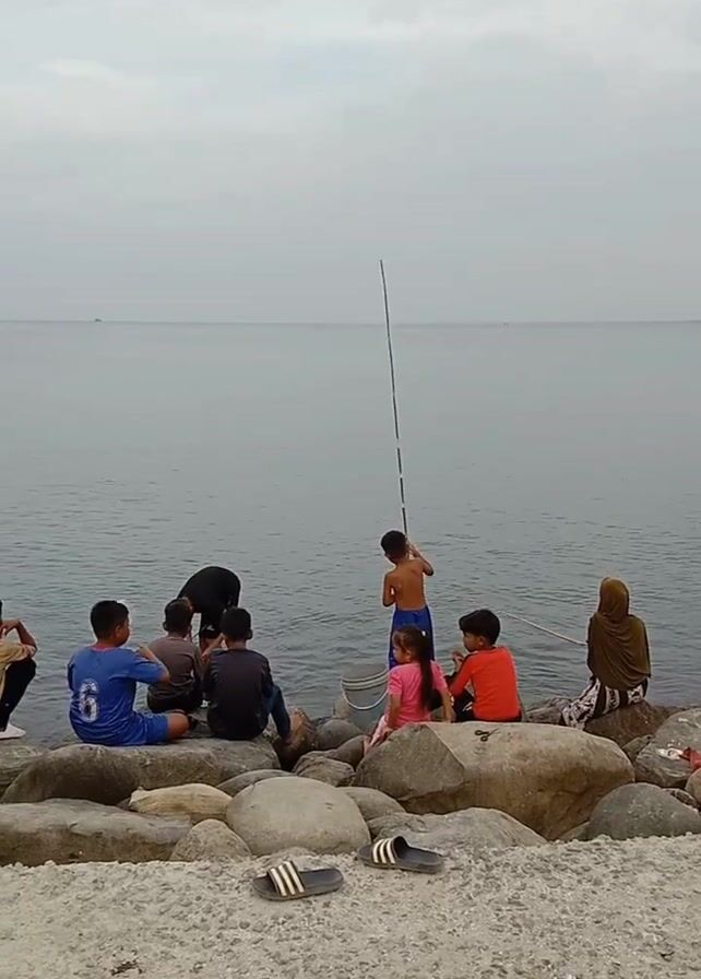 group of children and a woman sitting on large rocks at the edge of a calm body of water, likely the sea. The scene is under a cloudy sky. There are nine figures visible in the frame. Eight of them are children, varying in age, dressed in casual clothing, including shorts, t-shirts, and one in swim trunks. A fishing rod is standing unattended next to a boy in blue swim trunks. One child is holding a white plastic bag, peering into the water. There is also one woman wearing a hijab sitting at the right of the frame. A pair of black and white slide sandals sit on the concrete area in the foreground. The background is dominated by the expanse of water meeting the horizon under the overcast sky.