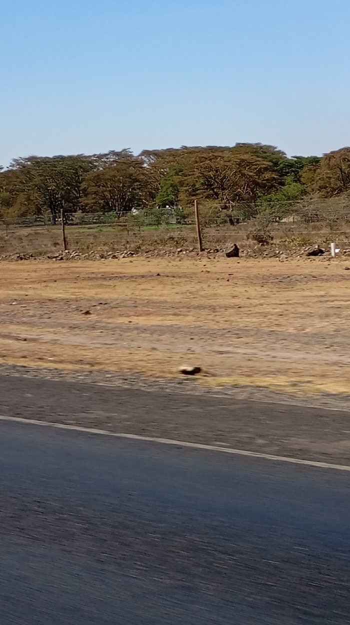 The photograph shows a road in the foreground with a brown, arid landscape beyond it. A sparse line of trees is visible on the horizon under a clear blue sky. In the landscape, a few dark shapes that might be rocks or animals are scattered. A simple wire fence runs parallel to the road, adding a sense of enclosure to the barren environment.