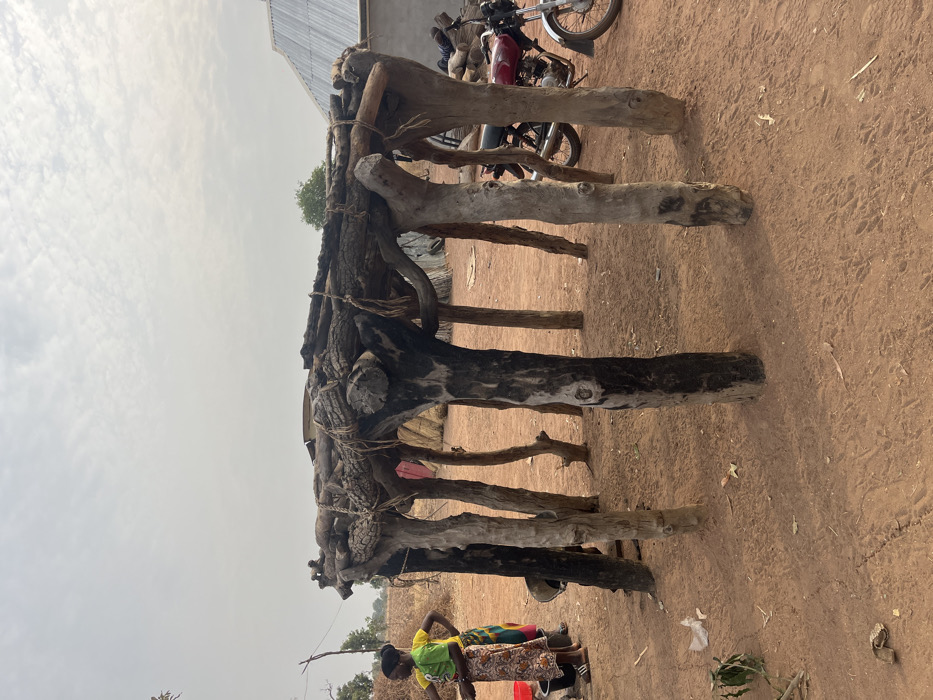A weathered, open-sided structure, likely a shelter or stall, stands on reddish-brown earth. It's constructed from thick, irregular wooden poles lashed together. A motorcycle is parked nearby. At the lower edge of the frame, two people are visible, one wearing a bright green shirt. The sky is overcast and hazy. A tin roof structure is visible in the background.