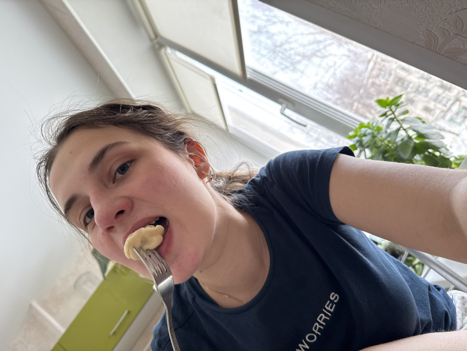 A female subject, appearing to be a young adult, is depicted in a residential interior, likely a kitchen or dining area, illuminated by natural light. She has dark hair, blue eyes, and light skin with prominent redness on her cheeks. She is wearing a dark blue t-shirt with partial white text "WORRIES" visible. A small gold-colored hoop earring is visible in her left earlobe. The subject holds a silver-colored metal fork to her slightly open mouth, with a single, light-colored dumpling (resembling pelmeni or vareniki) impaled on the tines, positioned for consumption. She is looking directly towards the camera. In the background, to the upper left, green kitchen cabinets or shelving units are visible against a white ceiling. A large window occupies the right side of the frame, featuring white sashes and partially raised white roller blinds. Through the window, an outdoor scene of bare trees and what appear to be distant residential or commercial buildings can be observed, indicative of an urban or suburban environment. A green potted plant is situated on the windowsill to the lower right. A light-colored, possibly textured wall is visible adjacent to the window on the far right. No specific landmarks or unique architectural features are discernible to pinpoint an exact location within the city of Chaikovsky, Russia, beyond a general residential or apartment setting.