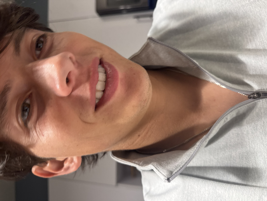 A close-up, chest-up image depicts a young adult male with brown, wavy hair, brown eyes, and a light complexion, exhibiting light stubble on his chin and upper lip