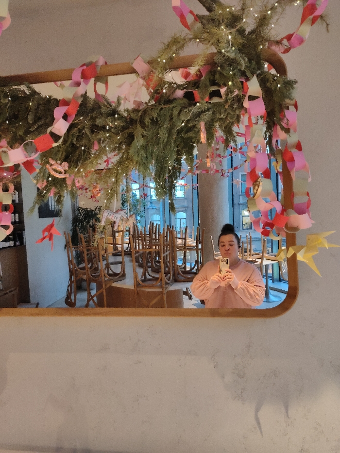 A woman in a pink sweater stands in front of a mirror, holding a phone and taking a selfie. The mirror reflects a restaurant interior with stacked chairs, a column, and a view of buildings outside. Festive decorations, including greenery, paper chains, and origami, adorn the mirror's frame. The lower part of the image shows the neutral-colored wall the mirror is hanging on.