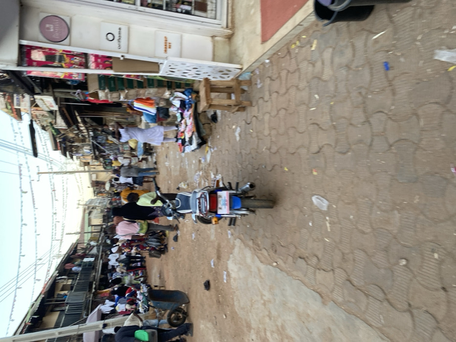 This image depicts a bustling street market in Jos, Nigeria, observed from a pedestrian's perspective. The scene is characterized by active human movement, commercial activity, and a mix of paved and unpaved surfaces. In the immediate foreground, a patterned concrete sidewalk, light brown in color, occupies the right side, extending from the bottom edge towards the midground. It is strewn with various pieces of litter, including plastic bags and wrappers. To the left of this paved section, the ground transitions to unpaved reddish-brown dirt, also scattered with debris. A blue and silver motorcycle, facing away from the viewer, is parked on this dirt section, positioned centrally. Its rear license plate is partially visible. On the far right edge of the paved sidewalk, two black plastic bins are present. The midground features numerous individuals, primarily pedestrians, walking in various directions. Most are dressed in casual clothing; some wear traditional attire. On the left side, several market stalls and displays are visible, including a light blue pushcart laden with clothing items. People are congregating, browsing, and moving through the crowded space. On the right side of the midground, a white commercial building stands prominently. It displays multiple vertical signs, including "Finixol" and "Oriflame," with "MAKEUP KIT" below the latter, suggesting a cosmetics or general store. In front of this building, a vendor operates a ground-level display set on a wooden crate, showcasing shoes and other merchandise. A simple wooden stool is positioned near this display. A person wearing a white dress or tunic stands behind the display, seemingly attending to the goods. The background shows the street continuing into the distance, lined on both sides by multi-story buildings that appear to house further shops and residences, some with balconies. Overhead, a complex network of electrical wires and strung green decorative elements or banners crisscrosses the street, indicating urban infrastructure and potentially festive adornments. The overall impression is that of a busy, dynamic commercial thoroughfare within a city.
