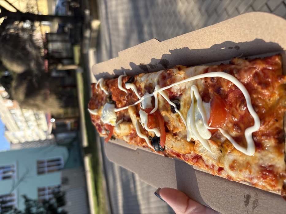 - "A first-person perspective photograph captures an individual's left hand, featuring dark nail polish on the thumb and forefinger, holding a long, rectangular slice of pizza in a plain brown cardboard tray" by FM-Qxeqi1, licensed under CC BY 4.0