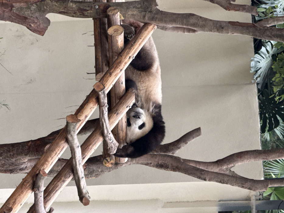 - "A panda hangs upside down on a wooden climbing structure, its head facing the viewer" by FM-K0Kp62, licensed under CC BY 4.0