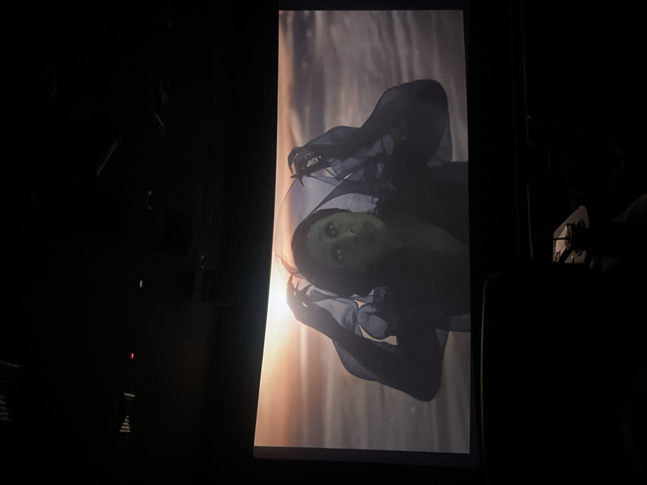 A movie screen displays an image of a green-skinned woman with long dark hair, seemingly underwater