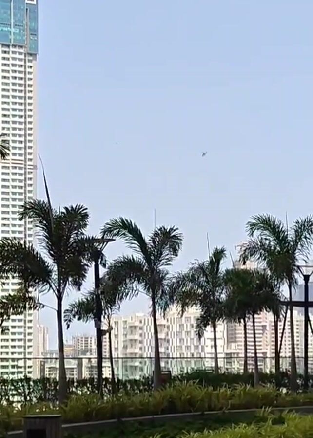 landscape with a tall skyscraper on the left and a row of palm trees in the foreground. Other buildings are visible in the distance. An object, possibly an aircraft, is seen in the clear blue sky. Someone is speaking, mentioning "CP".