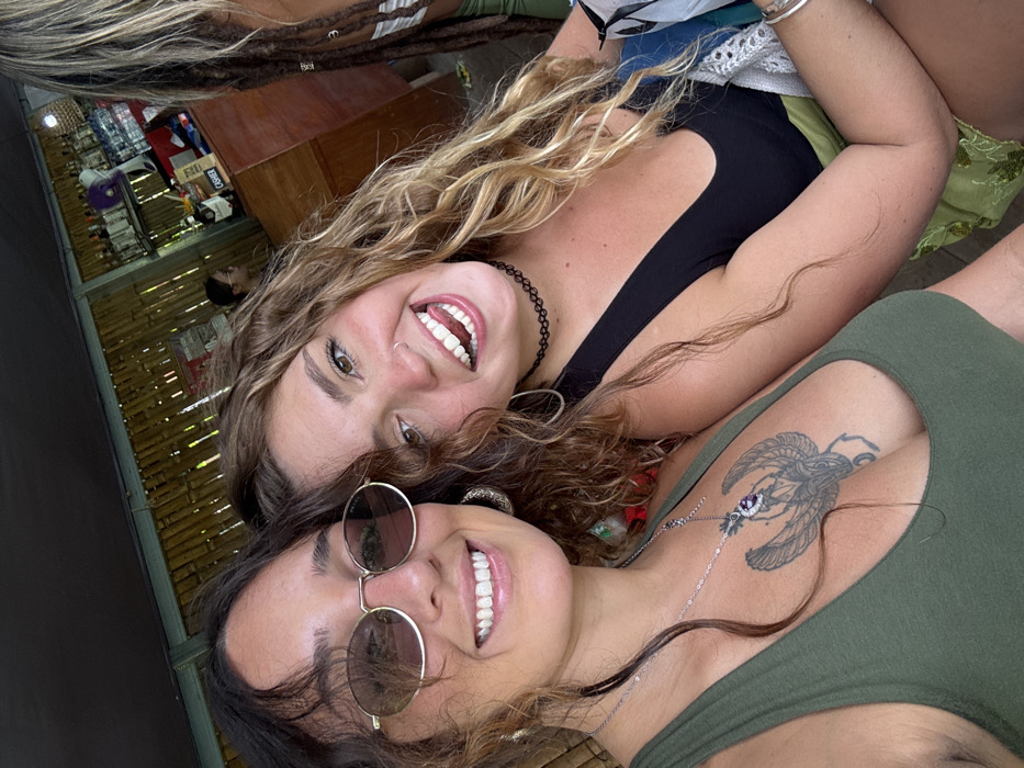 Two smiling women pose close together. One wears sunglasses, a green top, and a necklace over a tattoo on her chest. The other wears a black top and a choker, her tongue slightly visible. They have long, wavy hair. In the background, a building with a wooden structure is visible. A third person, partially obscured, appears at the top of the frame with what appears to be dreadlocks.