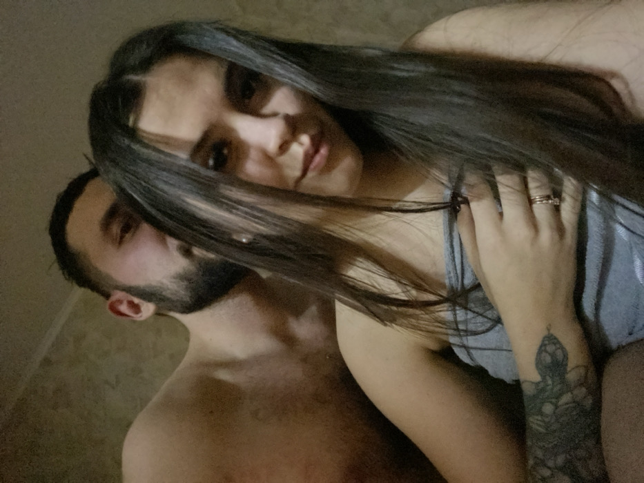 A couple poses closely together for a photo. The woman is in the foreground, wearing a gray tank top and multiple rings, with a tattoo visible on her forearm. Her long, dark hair falls across her face and shoulder. Behind her, a bearded man is shirtless. The background appears to be a dimly lit room with patterned wallpaper or tiling.