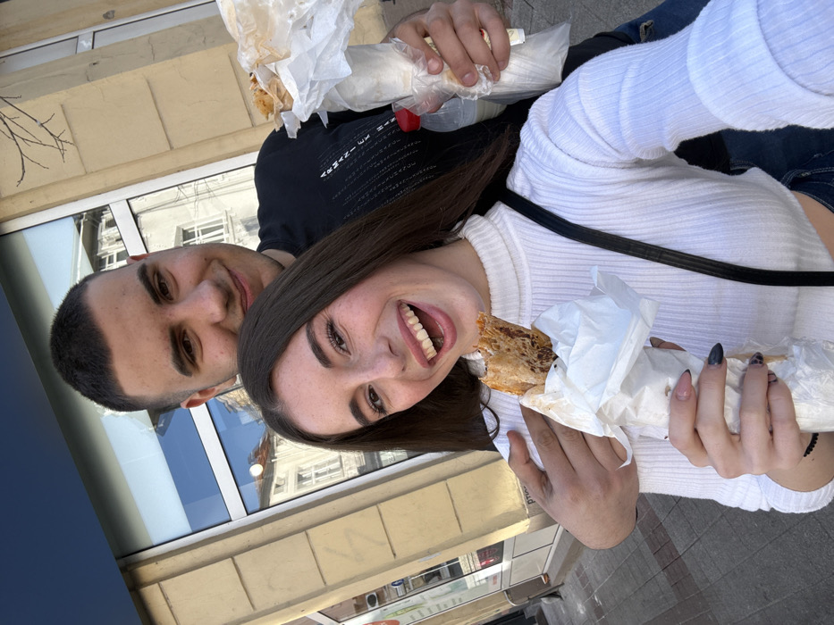 A selfie-style photograph captures two young adults, a female in the foreground and a male behind her, standing on a city street in Plovdiv, Bulgaria