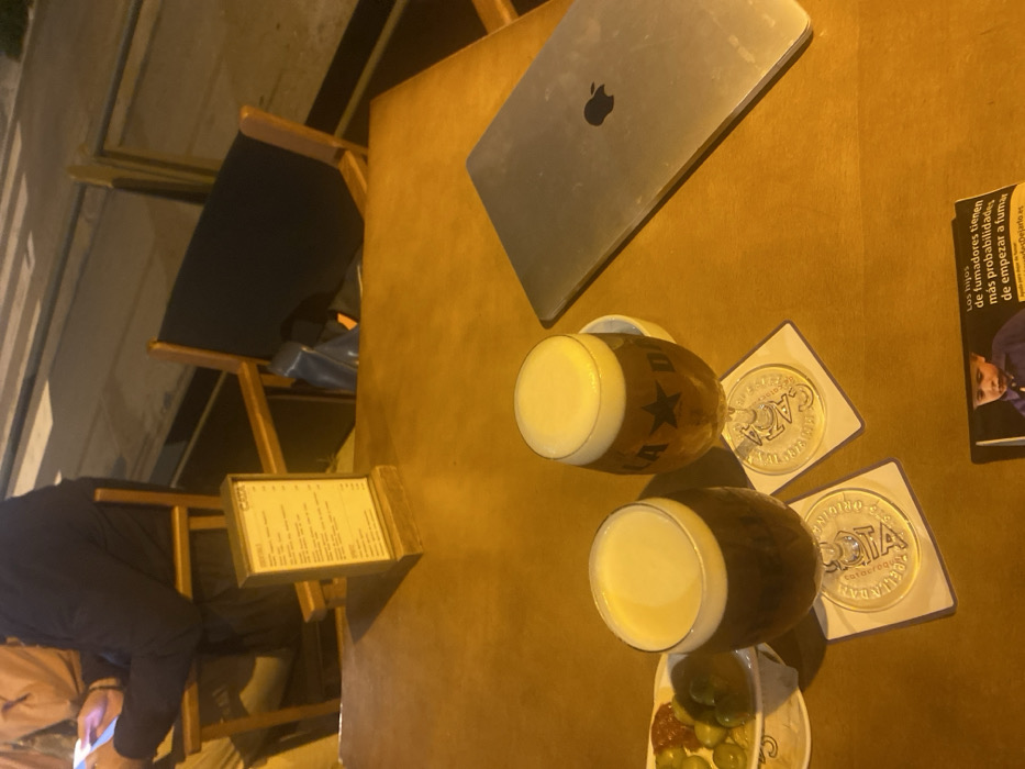 The image displays an evening scene on an outdoor terrace of a commercial establishment, likely a bar or restaurant, in an urban area of Barcelona, Spain. A light-colored wooden table dominates the foreground, featuring two glasses of beer with frothy white heads. One glass contains a darker-hued beer, and the other holds a lighter, amber-colored beer. Both glasses are positioned on white coasters embossed with "ESTRELLA GALICIA ESTABLISHED 1878 ORIGINAL GALICIA." To the left, a small white plate holds green olives and a red condiment. On the right side of the table, a closed silver Apple MacBook laptop rests. Further back on the table, a standing menu displays text in Spanish. In the upper left background, a person, partially visible, is seated at an adjacent table, wearing a dark jacket over a lighter garment and looking down at a smartphone in their hands. Behind the tables, wooden-framed director-style chairs are visible, along with a dimly lit street featuring faded zebra crossings. A portion of a pamphlet or magazine, containing a Spanish public health warning about the children of smokers, is visible at the bottom right.