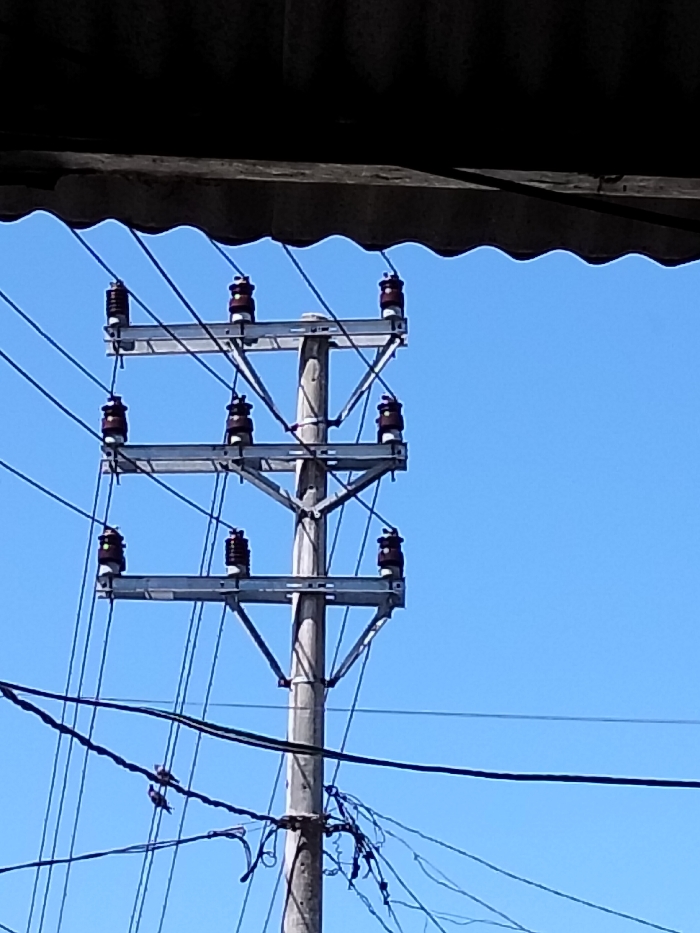 A utility pole stands tall against a clear blue sky. Three horizontal bars extend from the pole, each supporting three brown ceramic insulators. Electrical wires run along the pole, connected to the insulators. A corrugated roof section obscures the view from the top of the image. At the base of the pole, more wires hang loosely.