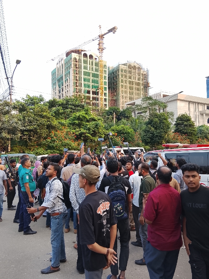 The scene captures a daytime street in Dhaka, Bangladesh, with a large crowd gathered
