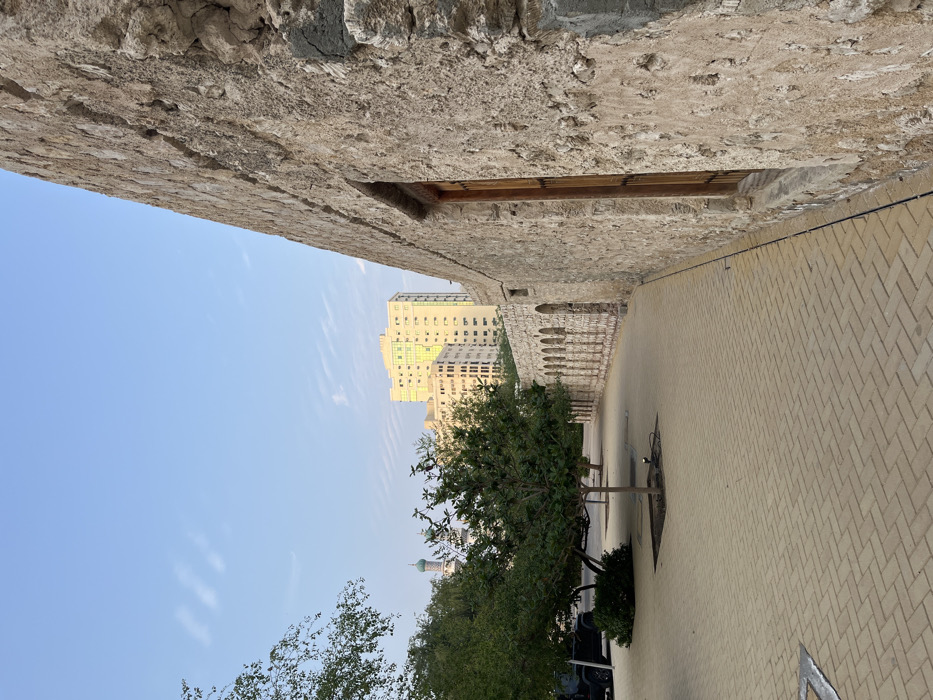 The image displays an outdoor urban environment in Sharjah, United Arab Emirates. A wide path composed of light beige interlocking pavers, arranged in a herringbone pattern, extends from the foreground towards the background. To the left of this path, several small trees with green foliage are planted in square ground openings; one tree includes a recessed ground spotlight at its base. A dark-colored vehicle, appearing to be a Jeep, is partially visible behind trees on the far left. Further along the left side of the path, a stone wall featuring a series of recessed arches is present. The right side of the scene is dominated by a substantial, roughly textured stone wall constructed from light-colored, irregular blocks. This wall contains a rectangular, recessed opening fitted with a dark wooden door or window frame, possibly featuring vertical bars. In the background, several multi-story buildings are visible, including a prominent light yellow/beige high-rise structure. A green dome and a minaret are discernible above the trees on the far left, suggesting a mosque. The sky above is clear and light blue with minimal, wispy clouds. No individuals are present in the scene.