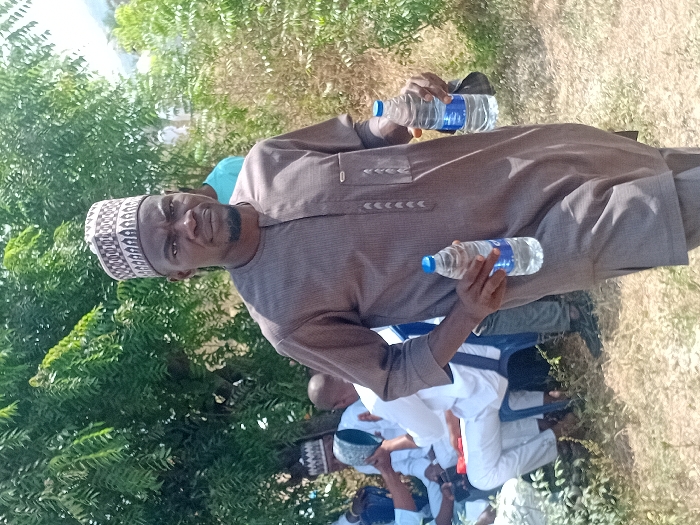 An African man wearing a traditional patterned kufi and a brown tunic holds two bottles of water outdoors. He stands in front of green foliage, with other people seated in the background. Some are wearing white clothing and similar hats. The man looks directly at the camera, while the rest are engaged with something out of view. The scene suggests a gathering or event.