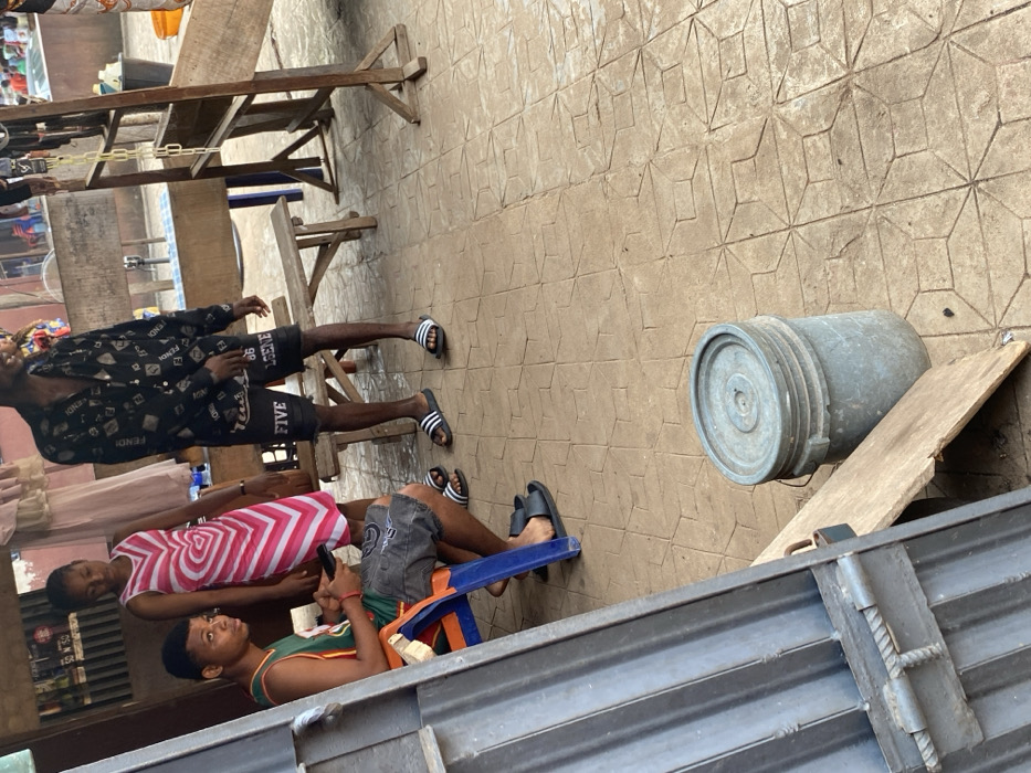 - "This image depicts an outdoor scene in Onitsha, Nigeria, featuring three individuals gathered on a tiled patio area outside what appears to be a shop or market stall" by FM-1sBXQ2, licensed under CC BY 4.0
