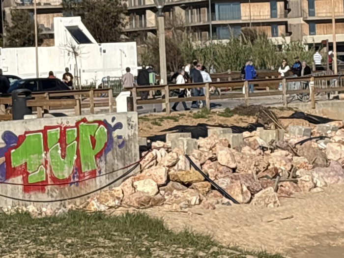 This image captures a bright, sunlit outdoor scene in Quarteira, Portugal, depicting a coastal or promenade environment. In the immediate foreground, sandy ground with patches of sparse green grass is visible. A weathered concrete retaining wall, approximately 1.5 meters high, spans the left mid-ground, prominently displaying "1UP" graffiti in green with a red outline and purple splatter details. To the right of this wall, a substantial pile of reddish-brown rocks, possibly riprap, is present on the sand, interspersed with several black flexible pipes. Above the wall and rock pile, a brown wooden railing extends horizontally across the scene, delineating a higher paved walkway or road. Behind this railing, a group of approximately 15-20 individuals is scattered, engaged in walking or standing. Notable figures include a person in a blue jacket, another in a black t-shirt with a white graphic design, and others in various casual attire. A dark-colored sedan is partially visible parked behind the railing on the far left, near a dark public trash bin. The background features dense green and brown vegetation, including tall reeds, obscuring parts of the view. To the left, white modular temporary structures are visible, one featuring an angled roof with a dark panel. To the right, a multi-story modern building with light-colored facades and dark horizontal accents is present. A dark utility pole stands vertically in the upper mid-ground. The scene is illuminated by strong sunlight, indicating a clear day.