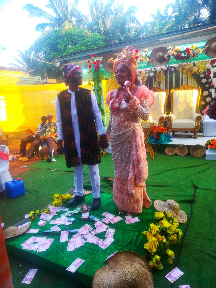 An outdoor event in Alor, Nigeria, features a man and a woman standing centrally on a green carpet