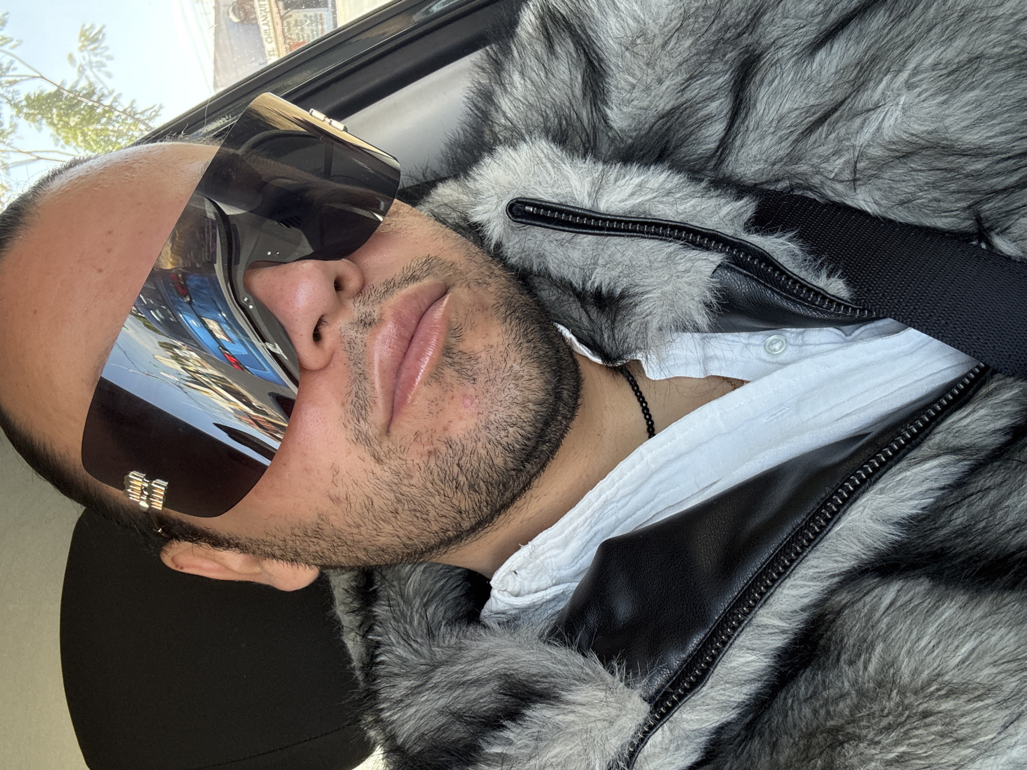 A man with short, dark hair and a beard is wearing oversized, mirrored sunglasses and a fur-trimmed jacket in what appears to be the interior of a vehicle