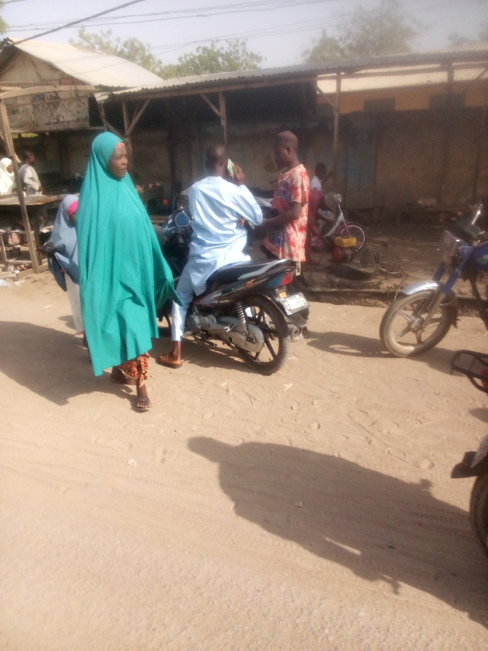 The image displays a sunlit, unpaved street scene in Rangaza, Nigeria