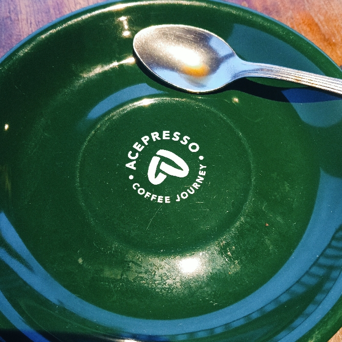 The scene depicts a close-up, overhead view of a dark green ceramic saucer with a metallic, silver-toned teaspoon resting on it. The saucer is positioned on a light brown wooden table with a visible grain, indicating an indoor setting in an establishment in Ciloto, Indonesia, likely a cafe or restaurant. The saucer features a white, circular logo centered on its depression. The logo contains two stylized, interlocking 'A' shapes, above which "ACEPRESSO" is written in an arc, and below, "COFFEE JOURNEY" is written in a corresponding arc, with small dots separating the text segments. The surface of the saucer exhibits minor scuffs and bright, specular reflections from an overhead light source. The teaspoon rests diagonally from the upper left to the lower right across the top right quadrant of the saucer. Its bowl reflects a bright, warm orange-yellow light, while its handle shows subtle ridged detailing. No individuals are visible in the image.