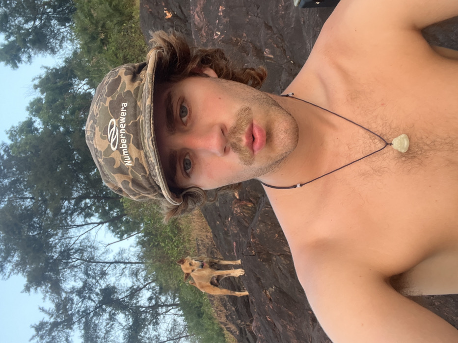 This image depicts a young adult male taking a selfie in a rocky coastal area of Gokarna, India, likely near one of its beaches. The male, positioned in the foreground and center-right, is bare-chested with light skin, visible chest hair, and light brown curly hair partially covered by a camouflage-patterned bucket hat featuring a white "Numbernewera" logo. He has a mustache, blue eyes, and his lips are slightly puckered. A black cord necklace with a light-colored, possibly jade, Buddha pendant hangs around his neck. In the mid-ground to the left, a medium-sized, light brown dog stands on a dark rocky outcrop, looking towards the camera. The background consists of dense green foliage and trees under a clear, light blue sky. The immediate ground is composed of dark, uneven rock formations.