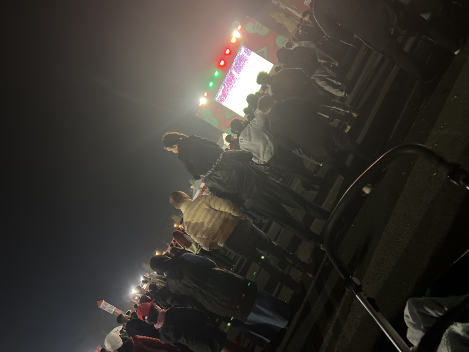 A nighttime crowd gathers outdoors, focused on a large screen. Lights frame the display. People wear various jackets and coats, some illuminated by handheld lights. A baby stroller is visible in the foreground. The scene is dark, but the screen illuminates the surrounding figures.
