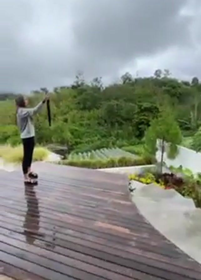 Here's a breakdown of the video: The video starts with a view of a wooden deck leading to a garden. The weather is overcast and it appears to have been raining, as the deck is wet. The garden is tiered and features a white wall. In the distance, there are trees and a hillside. A young woman enters the scene. She is wearing a grey sweatshirt, black leggings, and sandals. She appears to be taking photos or videos with her phone. She looks at her phone, checks something, and then the camera focuses on her face. The video then pans to show a wider view of the garden, including a circular structure that looks like a hot tub and rows of plants covered by clear sheeting. A lake is visible in the distance, obscured by fog and the cloudy sky.