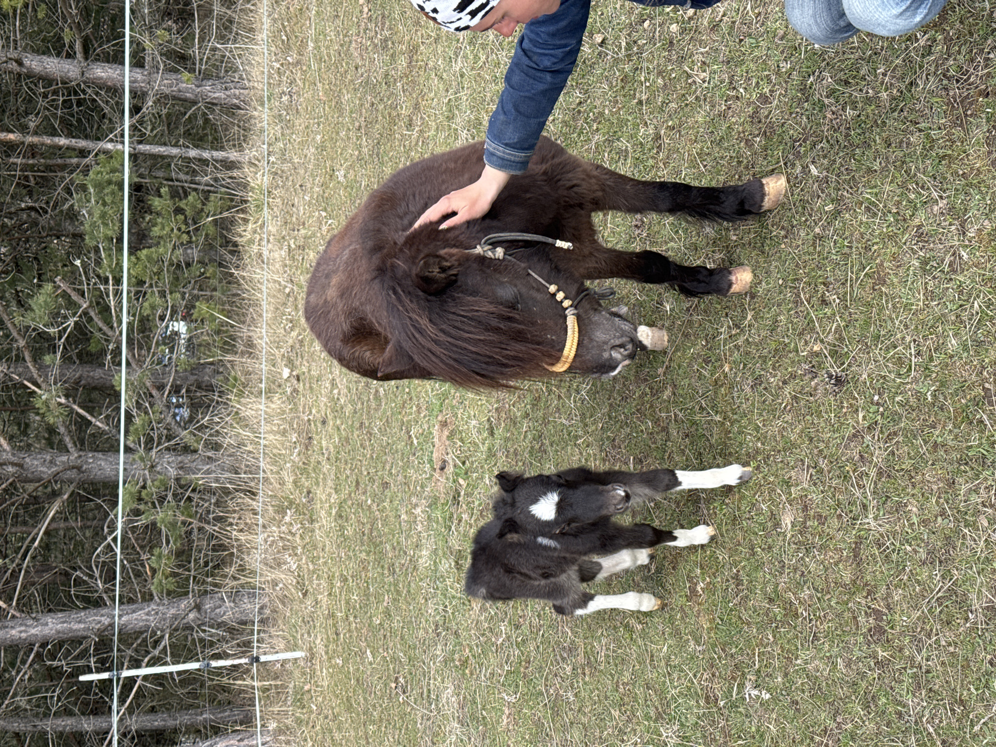 brown pony being petted by a person in a blue denim jacket and a black and white patterned hat, standing on a grassy field with dried grass patches. A black and white foal lies on its side on the grass, near the pony. In the background, a sparse pine forest is visible, and an electric fence runs along the edge of the forest. The location is Kovachevtsi, Bulgaria.