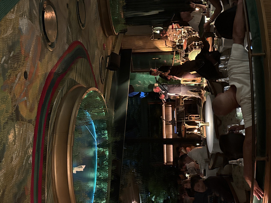 The image depicts an interior scene at night within Gekko restaurant, located in Miami, Florida, United States of America. The establishment features a dimly lit, luxurious ambiance with a live musical performance. The ceiling displays an ornate, textured surface with abstract painted patterns in muted colors, punctuated by recessed circular light fixtures. A prominent, large circular aperture in the ceiling is bordered by a brass-toned ring. Within this opening, numerous green plants hang downwards, illuminated by an ethereal blue-green light. A decorative band featuring red and green stripes runs across the ceiling. In the mid-ground, a four-piece musical ensemble performs on a slightly raised stage. A male trumpet player, dressed in a light-colored suit jacket and dark trousers, stands centrally, actively playing his instrument. To his right, another male musician in dark attire holds a microphone. Further to the right and partially obscured, a drummer is seated behind a drum kit. A fourth musician is partially visible on the far right. A trombone lies on the floor near the stage. The stage area is illuminated by focused spotlights. The foreground and mid-ground are occupied by numerous patrons seated at round tables with white tablecloths and upholstered chairs. In the immediate foreground, a bald male patron wearing a white t-shirt is seated at a curved green banquette, his back partially to the camera, observing the stage. A beer bottle and glasses are visible on his table. Other patrons are seated, engaged in conversation, dining, and watching the performance. Their faces are largely indistinct due to the low light. Small, metallic, conical objects serve as table centerpieces on some tables. The overall lighting is atmospheric, combining indirect illumination, recessed lights, and spotlights on the performers.