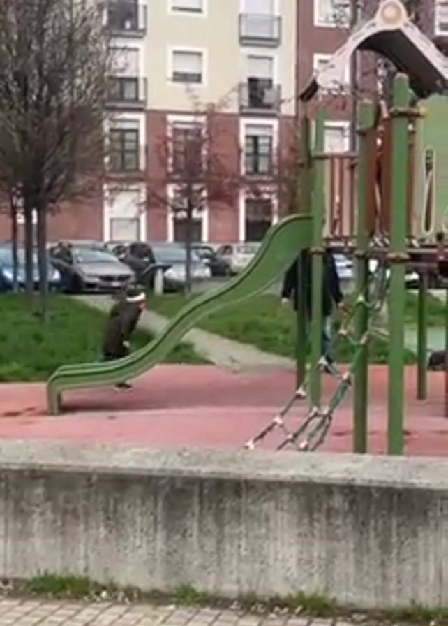 A child in a dark jacket and light-colored hat is running away from a green playground slide on a red surface. A man in a dark jacket is walking toward the playground equipment, which has climbing ropes. The playground is in front of a multi-story building with many windows and a few trees with bare branches. Cars are parked along the curb beyond the playground. The camera is behind a low concrete wall with brick pavers in the foreground. The sky is overcast.