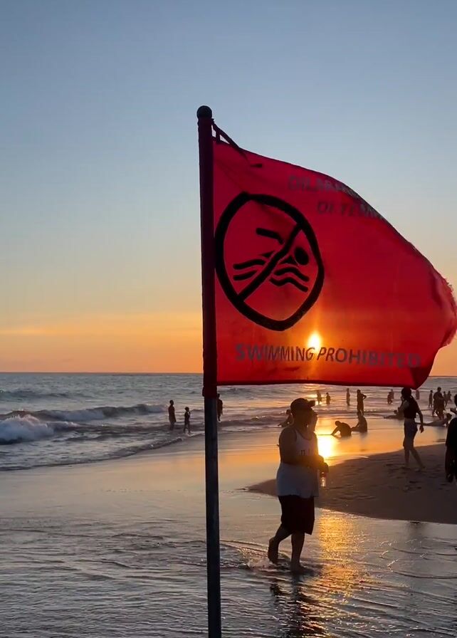 A red flag with a black symbol of a swimmer crossed out and the words "SWIMMING PROHIBITED" and "DILARANG BERENANG DI TEMPAT INI" is waving in the wind on a beach at sunset