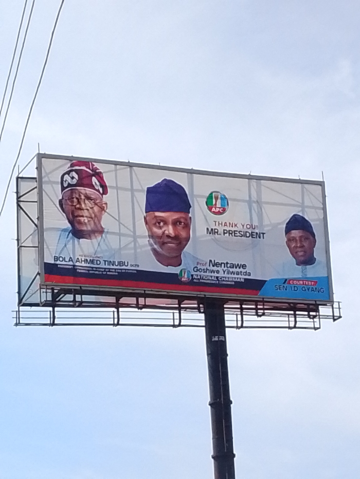 A large outdoor political billboard is depicted, mounted on a tall, dark-colored pole with visible horizontal structural supports. The billboard features three distinct portraits against a predominantly white background with a blue and red strip across the bottom. On the left, a man identified as "His Excellency Bola Ahmed Tinubu GCFR," President, Commander-in-Chief of the Armed Forces, Federal Republic of Nigeria, is shown wearing a red and white patterned cap and light-colored traditional attire. In the center, "Prof Nentawe Goshwe Yilwatda," identified as National Chairman and All Progressives Congress (APC) Governorship Candidate, is depicted wearing a dark blue cap and light attire. On the right, a smaller portrait shows "Sen ID Gyang" with a "COURTESY" notation, also wearing a dark blue cap and light attire. Above the central portrait, the green, white, and blue APC (All Progressives Congress) party logo is displayed, accompanied by the prominent text "THANK YOU! MR. PRESIDENT." The billboard stands against a clear, light blue sky, with power lines visible in the upper left quadrant. This billboard is situated within the city of Jos, Nigeria; however, the precise street or specific landmark details are not discernible from the image itself.