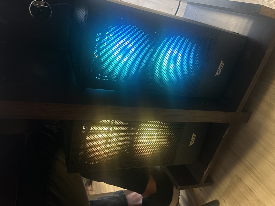The scene depicts an interior setting, likely a private residence or commercial establishment in Varna, Bulgaria. Two identical black desktop computer towers are positioned side-by-side on a dark wooden shelf, separated by a vertical wooden partition. The left computer tower displays two internal fans emitting a bright yellow/amber light through its mesh front panel. The right computer tower displays two internal fans emitting a bright blue/cyan light through its mesh front panel; the word "ASUS" is faintly visible through the mesh near the top. Both towers feature a silver, stylized logo near the bottom front, appearing as "VE" or similar. A person's lower leg, clad in dark trousers, and a dark shoe with a white sole are visible in the upper left, positioned near the left computer tower. The floor beneath the shelf is constructed of light-colored wooden laminate or planks. Wires are visible extending from the right computer tower. The ambient lighting is dim, with illumination primarily emanating from the computers' internal fan lights.