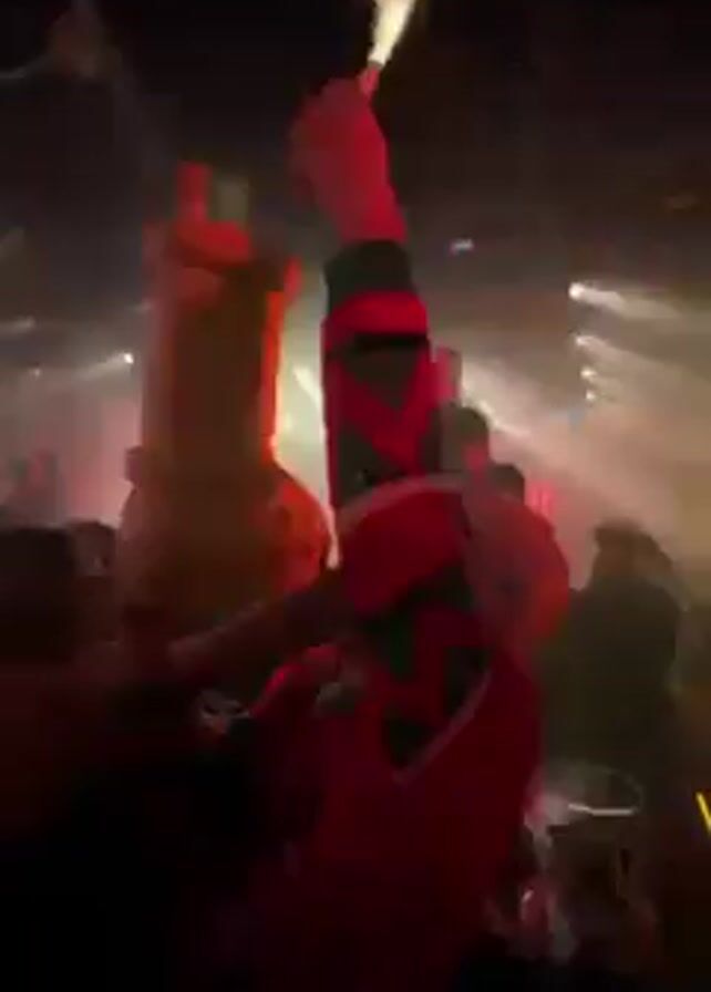 A person wearing a red shirt with a green and red trim, a white mask and a large yellow shoe raises it above their head. The shoe has a sparkler coming out of it. The person is in a crowded room with red and white lights, smoke and other people. The person is likely celebrating.