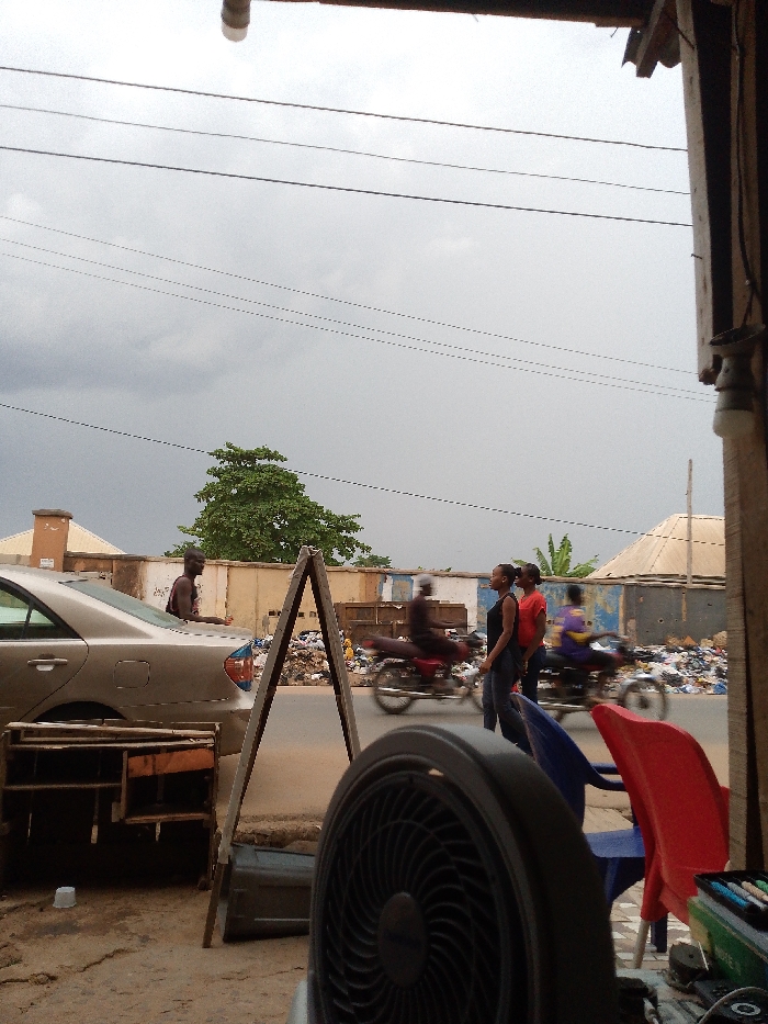 The scene depicts an urban street in Egbagu, Nigeria, under an overcast sky. In the immediate foreground, a black oscillating fan is partially visible on the right, alongside a blue plastic chair and a red plastic chair. A container with various colored objects, possibly chalk pastels or similar, is also present. To the left, a wooden structure and a light-colored A-frame sign stand are situated. On the street, a gold-colored sedan, consistent with a Toyota model, is parked on the left, with a male individual in a dark tank top standing near its rear bumper. Two motorcycles, blurred due to motion, are traversing the roadway. One rider, indistinct, is on a dark motorcycle, and another individual on a lighter-colored motorcycle is also moving across the frame from left to right. Three additional individuals are standing on the right side of the road; two females, one wearing a black top and the other an orange or red top, appear to be conversing. A third, partially obscured figure in a purple shirt stands further back. The background reveals a low wall or fence line behind the street, beyond which substantial piles of refuse and garbage are visible. Further in the distance, buildings with light-colored roofs and scattered trees and vegetation are present under the uniformly gray, cloudy sky. Multiple dark electrical or utility wires stretch horizontally across the upper portion of the frame.