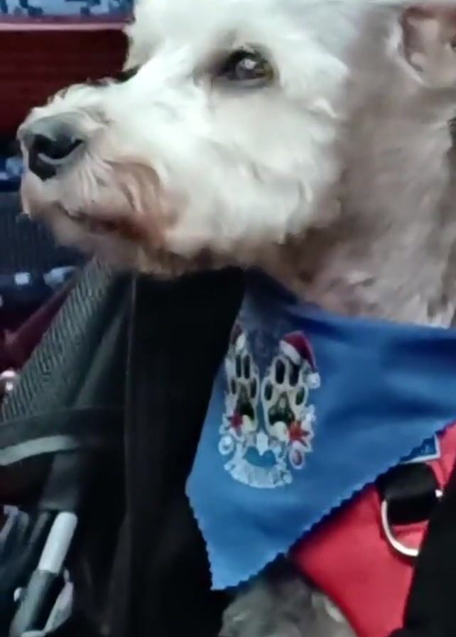 A white dog with a blue bandana is sitting in a carrier. The dog has a long, shaggy coat and a black nose. The bandana has a Christmas theme with paw prints and Santa hats. The carrier is black with red straps. The background is blurry.