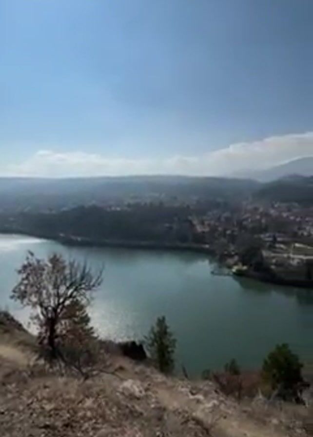 scenic landscape with a body of water surrounded by greenery, likely a lake or a wide river. A town or city is visible on the far side of the water, nestled between the water and mountains in the distance. The viewpoint is from a high vantage point, possibly a hill or a mountain slope. The sky is blue with some clouds, and the sun is shining brightly. The foreground shows dry grass and sparse vegetation, suggesting a natural and somewhat rugged environment. There are no people visible in the frame.