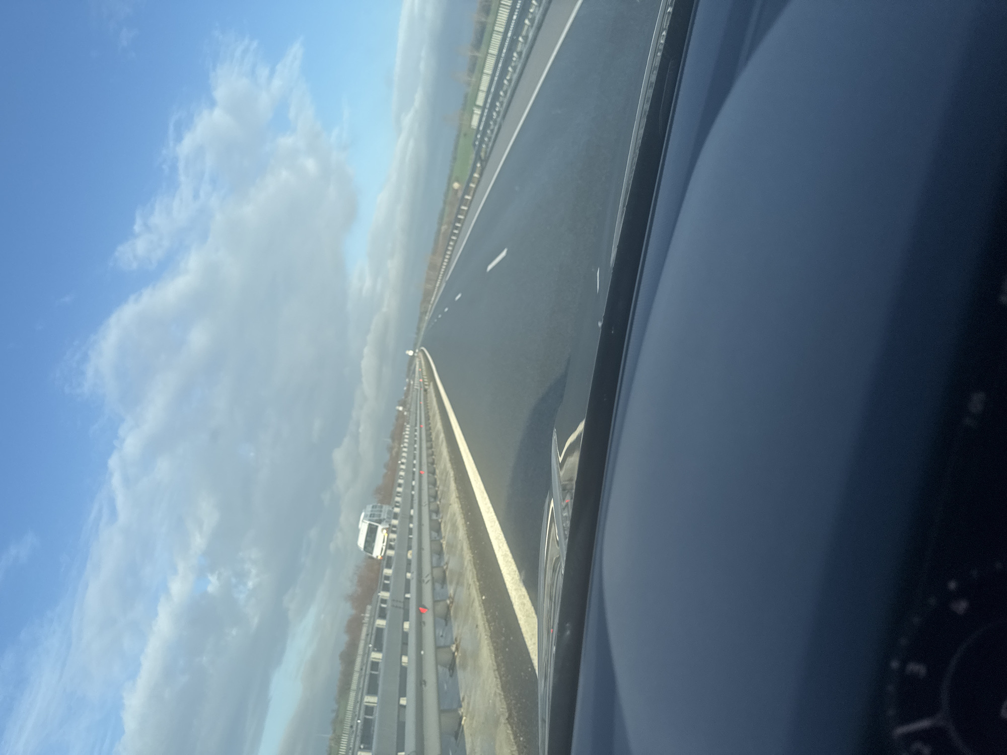 The image depicts a daytime scene from the interior of a vehicle, looking forward through the windshield onto a multi-lane highway in Воденичане, Bulgaria. The vehicle's dark-colored dashboard occupies the lower portion of the frame, showing a glimpse of a speedometer or control panel on the far lower left. The asphalt highway surface, marked with white solid and dashed lines, appears damp or wet, reflecting light in some areas. A metal crash barrier with red reflectors extends along the left side of the highway, separating the road from an embankment featuring sparse, deciduous vegetation. In the distance on the left, a white van, possibly a Mercedes-Benz Sprinter, is visible traveling in the opposite direction. The right side of the highway borders green fields. The sky above is partly cloudy, with significant patches of blue sky visible amidst white and grey cloud formations. The overall environment is open and rural or exurban, under conditions suggesting a recent or ongoing period of damp weather.