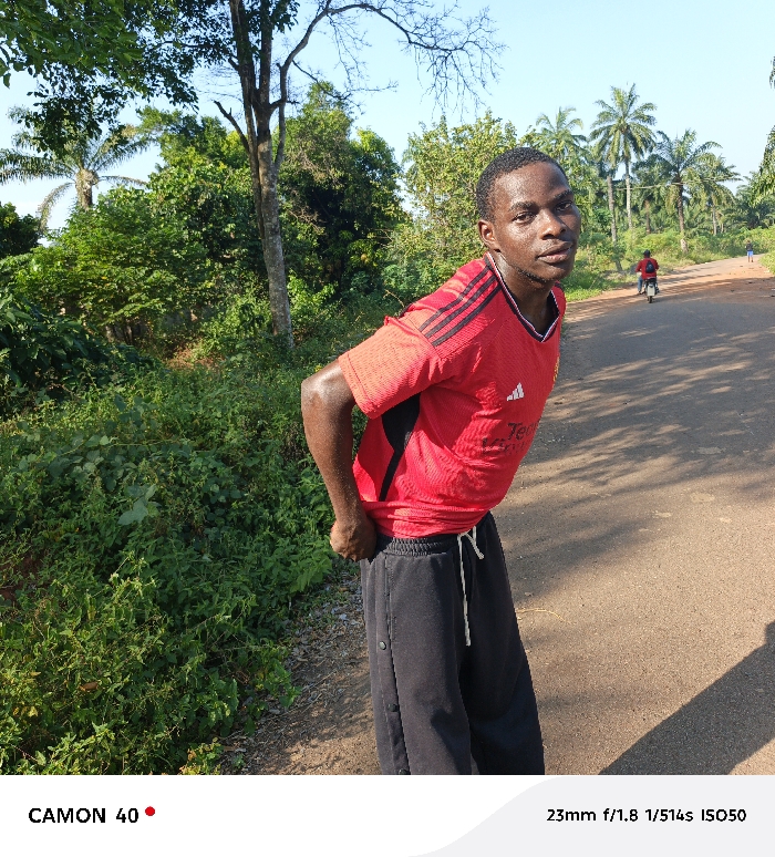 The scene, located in Agbani, Nigeria, depicts an outdoor rural or semi-rural environment under clear daylight